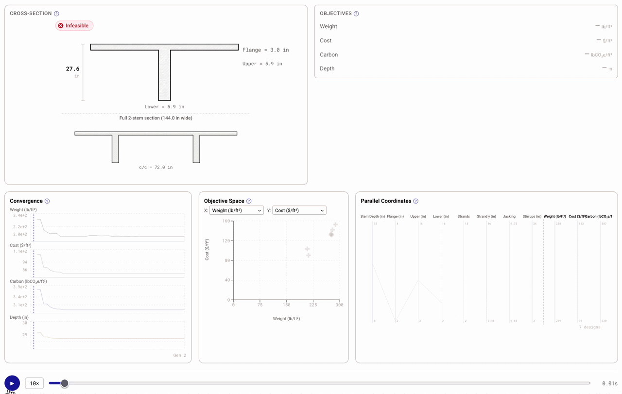Optimize for the objective that matters most — material weight, estimated cost, or embodied carbon. Compare results across molds to find the best fit for your project.